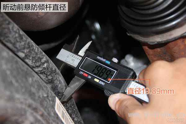防倾杆能有效减少车辆高速转向时车辆的横向侧倾,提高车辆稳定性。电子游标卡尺测得昕动的前防倾杆直径为19.89mm。