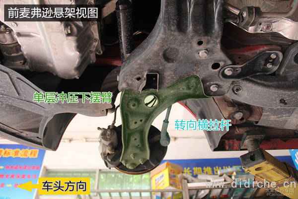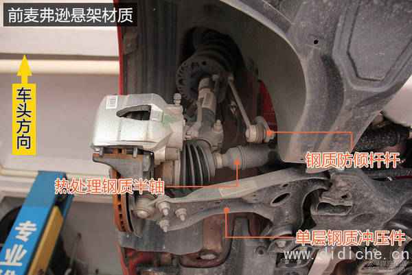 和大众的其它车型一样,昕动的前悬继续沿用麦弗逊前悬。悬架部件皆采用钢材质,下摆臂使用的是单层钢板冲压而成,副车架则采用双层焊接的冲压钢板,整体的刚度相比单层冲压钢板要好。