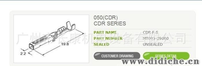 TYPE FEATURESTYPE050(CDR)SERIESCDRMATERIALCOPPER ALLOYKINDTERMINALFINISHTINMALE FEMALEFEMALEAWG#24-22APPLICABLE WIRE SIZE(?)AVS 0.2 ~ 0.3