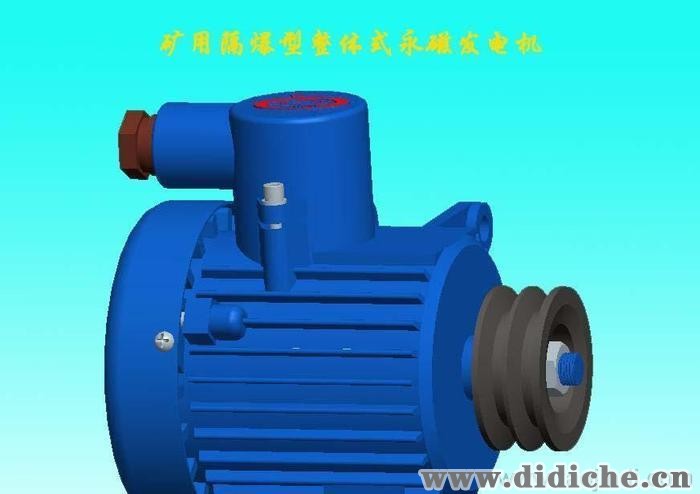 “雁星牌”矿用隔爆型永磁发电机和矿用隔爆型带真空泵永磁发电机分为发电机与调节器结合为整体式隔爆发电机和非整体式隔爆发电机,非整体式隔爆发电机需匹配相应规格的隔爆发电机电压调节器一起使用。一、 结构、用途及工作条件 隔爆型永磁发电机的防爆采取隔爆结合面的结构形式,定子为铁芯上嵌入线圈绕组,转子为永磁极安装在磁轭的周围,用耐热塑料成型槽楔固定,成为凸极转场式同步发电机,通过电压调节器整流调节后,提供稳定直流电源。该发电机可用于易产生甲烷气体的煤矿井下为运输车、装载机、挖掘机以及石油化工有爆炸物体环境的仓库、车站、码头等场所的机动车及内燃机为动力的作业机械提供充蓄电池和照明用电。隔爆永磁发电机适应于以下环境条件使用:1、环境温度-40℃~75℃。2、环境相对湿度不大于95%3、大气压力80KPa~110KPa4、空气标准含氧量(体积比)21%5、在具有甲烷爆炸性气体混合物和粉尘的煤矿井下6、无破坏绝缘的腐蚀性气体的场所。 二、 型号说明 举例说明:功率400W,电压等级24V,整体式永磁发电机标示为 YFB-400/24Z。三、 发电机外形及安装尺寸图