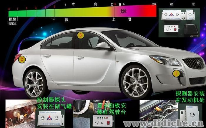 一、安装说明1.报警控制器应安装在需要测试燃气泄漏的场所(如后备箱),在后备箱应安装在距燃气瓶出气口最靠近的位置并注意安装在上方位置。2.显示面板安装在车内仪表盘恰当的位置,由线束和报警器控制器连接。3.探测器安装在需要测试燃气泄漏的场所(发动机仓)。在发动机仓应安装在远离热源的上方位置。并由线束和控制面板连接。4.关闭器,有连接装置安装在钢瓶的关闭阀上,和报警控制器连接。5.显示面板出线有红、黑两根,接入选定的输入电源。红接正,黑接负。6.停车是否关闭报警器电源,由用户安装时自己决定。7.参考报警装置使用手册说明书接线。注意:1.控制显示面板应安装于易于观察的位置。2.探测器应安装在易于检查,有燃气泄漏的地方。3.请不要使用超高浓度的气体检验本机,以免损伤报警器的寿命,而且可能危害人体的健康。4.严禁安装过程中,振动、跌落、冲击本产品,否则将会失效。5.探测器不可安装在通风良好或气流较大处6.探测器不可被他物体遮蔽。7.探测器严禁与有效期、酒精接触有这两种气体时应立即将报警器隔离。以防止损坏传感器。 二、使用说明a. 调试1.按照安装中的要求将报警器安装固定好。2.打开开关,接通报警器的电源,此时电源指示绿灯闪烁,报警器进入预热状态。此时报警器无检测气体功能,约1-3分钟后,报警器进入正常监控状态。3.如车内环境中的天然气泄漏达到报警浓度值时,报警装置即进入报警状态。此时控制显示面板防区指示绿灯和红灯点亮闪烁,同时发出报警声音。(具有关闭功能的报警器在报警后迅速启动紧急切断阀,及时自动关闭钢瓶阀门)。4.当环境中的可燃气体浓度下降到低于报警浓度时,报警指示停止闪烁,报警装置恢复到检测状态。(具有关闭功能的报警则按下显示面板的测试按键,使关闭器打开钢瓶阀门,打开后切断阀将开关恢复到“检测”状态)。 b. 应急处理1.当各防区指示灯与红色报警指示灯点亮同时伴有报警声音时,表明环境中存在较高浓度的燃气泄漏存在。发现者应立即按下列程序进行检查。2.关闭所有燃气源(储气瓶开关等)。3.立即打开车门、车窗使空气对流,自然排气。4.此时严禁点火及开启其它电器产品。5.如果有人感到头痛、反胃、全身乏力、烦躁或休克等症状,应送往医院急救。6.燃气消退后,查检事故原因,及时处理。7.如无法排除事故原因,请燃气专业人员前来排除泄漏故障。8.属报警质量原因,请联系供应商进行检查。9.属燃气泄漏,请联系相关部门,检查可能产生泄漏的气源.10.注意:油漆、化妆品、酒精等化工气味可能引起探测器报警,应使这些物品远离探测器,减少误报。c. 故障分析与排除1.YK-828/CB车用报警器属安全防范产品。开机后最好不简短运行,不可切断电源,保证电源正常供电,没有电源供应,报警器不工作。2.在使用和维护过程中,若发现有故障现象,应及时处理,不能解决时应及时和售后服务中心联系。3.该产品投入正常运行后,用户根据自身条件定期进行自检加气检查,以确保正常运行。4.安装位置应按照安装中的要求,不可随意移动和改变安装位置。