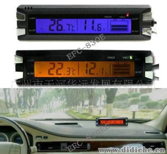 产品型号:EFC-830E 车载双温度计/电瓶电压检测报警器产品功能: ■ LCD 数字显示室内外双温度(-20---60摄氏度),℃∕℉转换 ■温度过低时的冰点霜点报警功能(-1摄氏度) ■ 车上电瓶电压的实时检控和当前电压显示(8-24V) ■电压过高或过低的声光报警功能。 ■ 最低、最高温度湿度报警设置 ■ 橙色或蓝色背光 ■ 背部魔术贴几可折叠角度调整支架 ■ 车载适配电源插头(12/24V) ■ 电池: CR2032 x 1产品尺寸:136*23*34mm外箱尺寸:325*282*382mm,装箱规格:36pcs/5.2kgs更多类似产品-车内外温度时钟:车载电波钟 我公司生产汽车精品和商务礼品,产品系列有:车载电子时钟、车载电波钟、车载气象钟、温度湿度气压计、多功能电子钟、旅行钟表、语音报时钟、倒计时器、收音机、广告钟表、指南针等。 更多产品,敬请浏览网站: www.cedarelectron.comhttp://huayuangz.cn.alibaba.com【订购方式】所有产品需要双方制作订购合同,付款方式是预付30%定金,余款验货合格后出货前付清,【验货标准】常规验货标准2.5 /4.0,可以根据客户实际要求另行商订【售后服务】每个产品出厂前都要通过QC功能检测和外观检测和QA质量标准检测合格后方可出厂出厂后半年内负责免费维修(出厂后运费由买方负责)【LOGO制作】可以按照客户要求印LOGO或广告,印刷费另议,3000个以上定单免单色丝印费用Guangzhou Tianhe Huayuan Development LtdAs a China manufacturer of consumer electronics and novelty gifts, we supply digital calendars, calculators, euro calculators or currency converters, LCD clocks, LED clocks, quartz clocks, weather station clock, timer clock, talking clock, projection clock, radio controlled clock, novelty digital clock, game players, novelty clock radios, digital video cameras, digital camcorder, digital photo frame, portable media players, electronic gifts and promotional items.Welcome to our web:http://cedar-gifts.en.alibaba.com