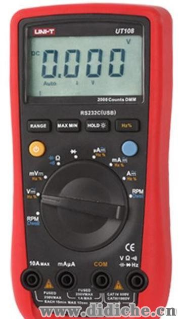 UT100系列(手持式汽车多用表) -> UT109 技术指标基本功能量程基本精度直流电压4V/40V/400V/1000V±(0.5%+3)交流电压4V/40V/400V/1000V±(1%+3)交流毫伏电压40mV/400mV±(0.8%+3)直流电流400μA/4000μA/40mA/400mA/4A/10A±(1%+2)交流电流400μA/4000μA/40mA/400mA/4A/10A±(1.2%+5)电阻400Ω/4kΩ/40kΩ/400kΩ/4MΩ/40MΩ±(1%+5)电容10nF/100nF/1000nF/10uF/100uF±(3%+5)频率10Hz-1MHz±(0.1%+4)温度-40℃-537℃±(1%+10)特殊功能自动量程√闭合角4CYL/6CYL/8CYL±(3%+5)转速4CYL/6CYL/8CYL±(3%+5)二极管测试√通断蜂鸣√最大最小值√数据保持√自动关机√背光√RS232数据传输√低压显示√电压测量输入阻抗≥10MΩ√最大显示3999一般特征电源9V 电池(6F22)LCD尺寸65*43mm机身颜色红色+灰色机身重量370kg机身尺寸180*87*47mm标准配件电池、表笔、RS232数据线、软件光盘、点式K-型热电偶、鳄鱼夹可选配件转换插头、USB数据线 (* 需收费)标准包装彩盒、说明书、保修卡标准包装数量20台标准包装尺寸465*335*345mm