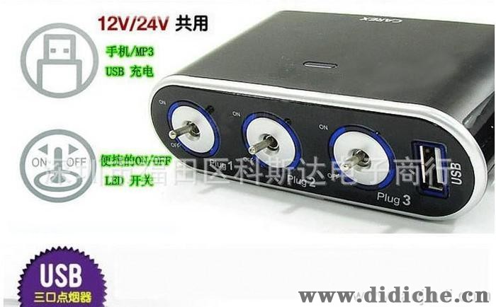 最大可通过电流:5A(超过这个电流,会损坏本品)具有3个点烟器插孔(带独立开关)和一个USB插孔。1 可以把车内点烟孔由1个扩展成3个2 同时设计有一个USB插孔,可供PDA ,ipop ,gps等设备供电.3 点烟器插头带有保险,可以保护内部电路,也非常容易维修更换。本款带有开关,随意开启电源,不用的设备可以关闭,带有LED显示灯,夜晚看起来更美观运输说明:基本支持任何物流、快递渠道;广东省内可以货到付款;售后服务:产品出货前,均经过专职人员、专业生产测试仪器严格测试,合格产品才准许出货流通,供给客户的产品保证100%是合格品。但是在运输过程中难免出现意外,致使客户收到货后会出现个别不良品,为了更好保证客户利益,凡属我司的产品,在客户收到货后一周以内,确定有质量问题的产品一律无条件更换新品,一年质量保证,彻底消除客户的售后之忧。