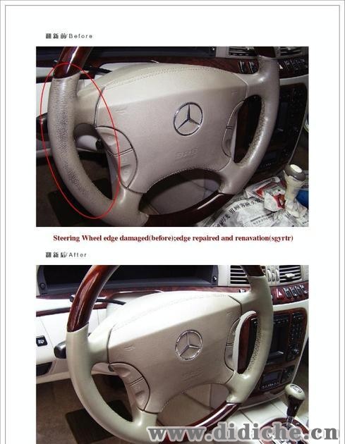 汽车内饰维修翻新、上色补伤 本公司自己生产由ISO900资格认证优质皮化原料,无毒无害.环保型、依照严格的技术操作流程,汽车真皮座椅翻新、方向盘、车门板、仪表台经过清洗、补伤,上色、改色、裂纹修复等工艺,从而还您汽车的第二次青春!