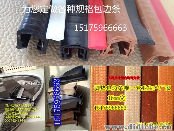 后备箱垫包边条 汽车后尾箱垫包边条 森特脚垫包边条批发规格:内卡槽5MM,特殊规格可定做包装:一卷100M 一件4卷 可根据客户要求定制特点:立体高边,更显整体造型美感;能有效防止砂 泥 水 雪 污染车内地毯保持车内清洁本公司可提供,挤出密封条,发泡密封条,橡胶密封条,三元乙丙密封条其特性主要如下1.质量轻、隔热、保温、防潮、阻燃、耐酸碱、抗腐蚀;2.稳定性、介电性好,耐用、抗老化,易熔接及粘合;3.抗弯强度及冲击韧性强,破裂时延伸度较高;4.可以.通过捏合、混炼、拉片、切粒、挤压或压铸等工艺加工成型一,可满足各种型材规格的需要;5.表面光滑、色泽鲜艳、极富装饰性。主要适用于:a.各种型材、各类型门窗上所用的防撞胶条;b.各种橱柜、隔断、特殊地板中所用的减震封边条;c.淋浴房、卫浴、康体设备等用来防水的刮条,封边条;